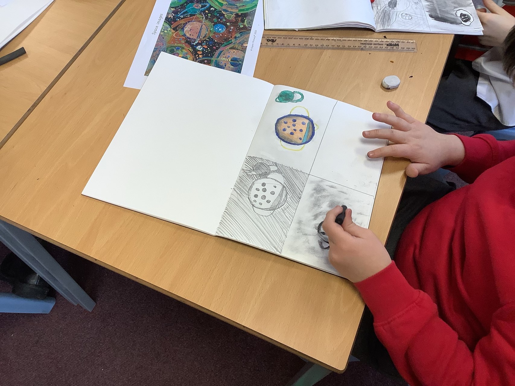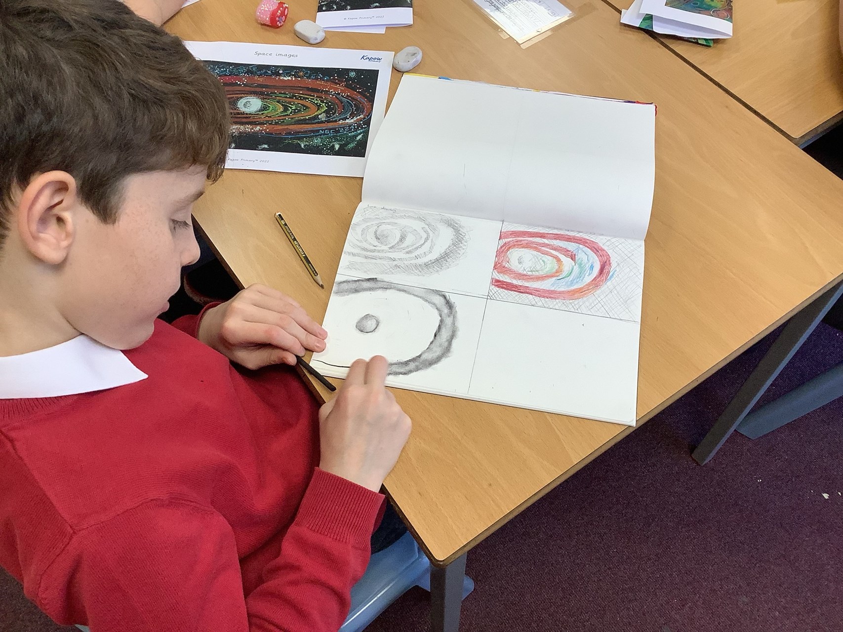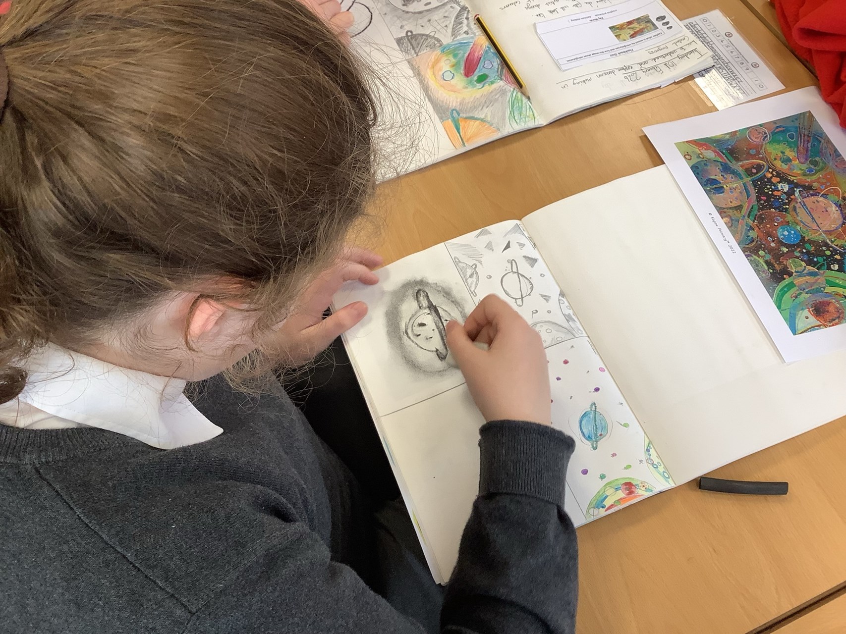 In Art, Year 5 have been exploring different drawing decisions, carefully considering how artists create texture and depth within an image. The children experimented with a range of techniques and materials, focusing particularly on how tone and texture can be developed using charcoal. They showed fantastic concentration and creativity as they refined their shading skills.
