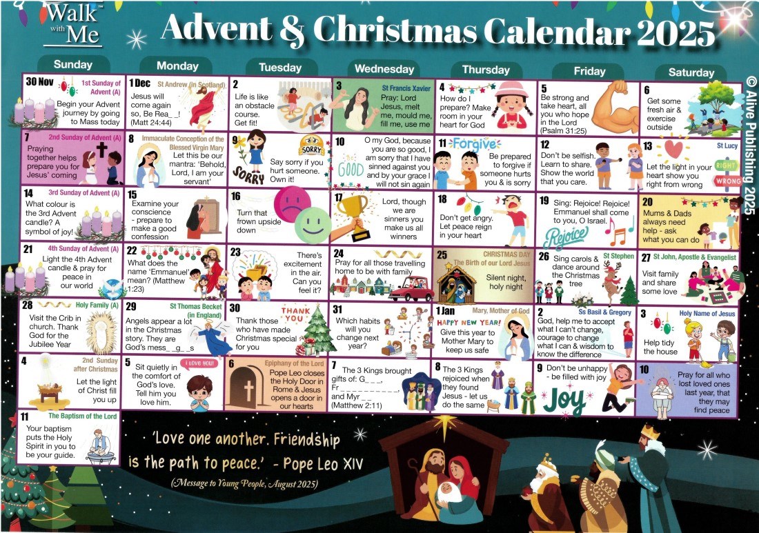 As we begin this season of preparation for the coming of Christ, our school will be helping the children reflect on the hope, faith, joy, and peace that Advent brings. We invite you to support your son or daughter’s spiritual journey at home by using the Advent calendar together each day as a simple way to pray and prepare your hearts for Christmas.